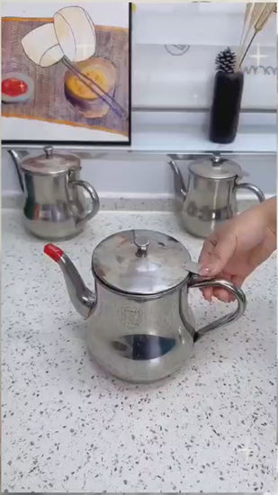 الحل بسيط مع إبريق المعدن العملي المزود بمسكة مريحة ومصفاية دقيقة، ليصفّي الزيت ويحفظه بكل سهولة ونظافة.